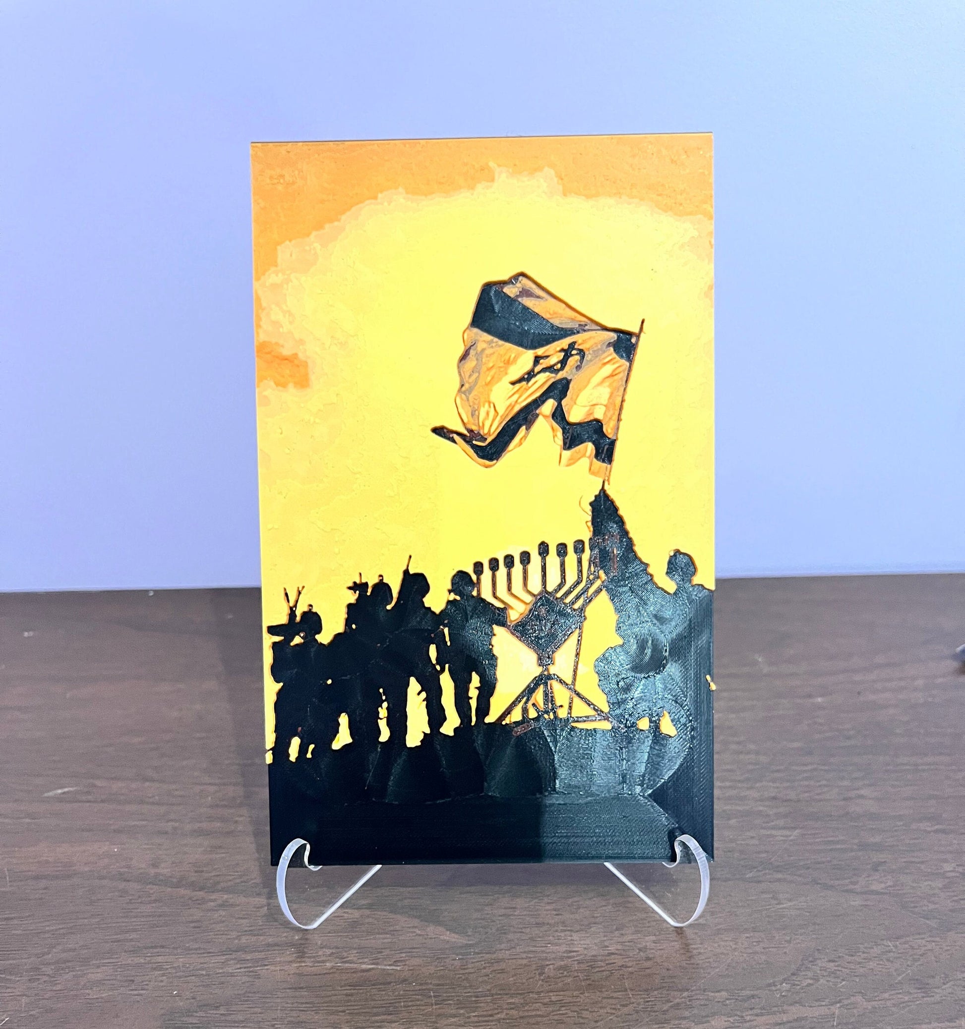 Show your support for the brave defenders of Israel with this 3D printed color lithophane of Yigal Slavin's photo of the Israeli Defense Forces lighting a Menorah in Gaza.